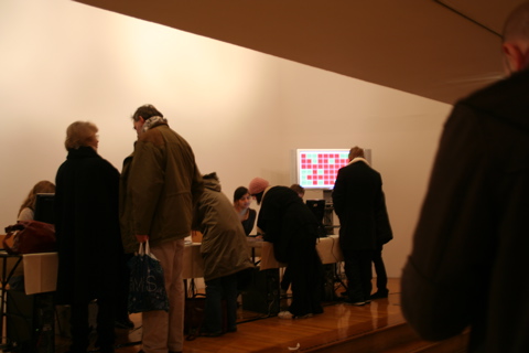 会場内のスクリーンには、売れたカードと残っているカードの番号が表示されていて、みんな各々研究して持参している何十枚もの写真のコピーと、お目当てのカードの番号を書いた表とペンを手に、スクリーンとにらめっこです。