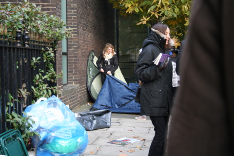 ビルの前には、先頭グループが陣取っていた場所に、テントや宅配ピザの残りなどがあり、ちょっとした生活感が出ていました。