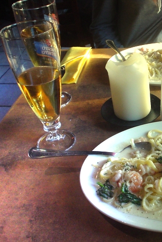 お出かけ前に近所のお店で晩ご飯を食べて、まずはビール一本ずつ。