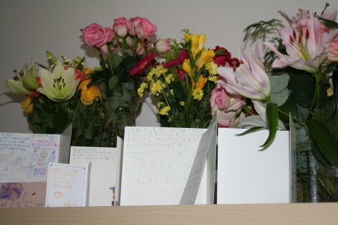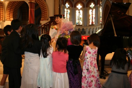 会場の写真がまだ手元にないので、ひとまず演奏後の妻に花束を持って来てくれる子供たちの図。